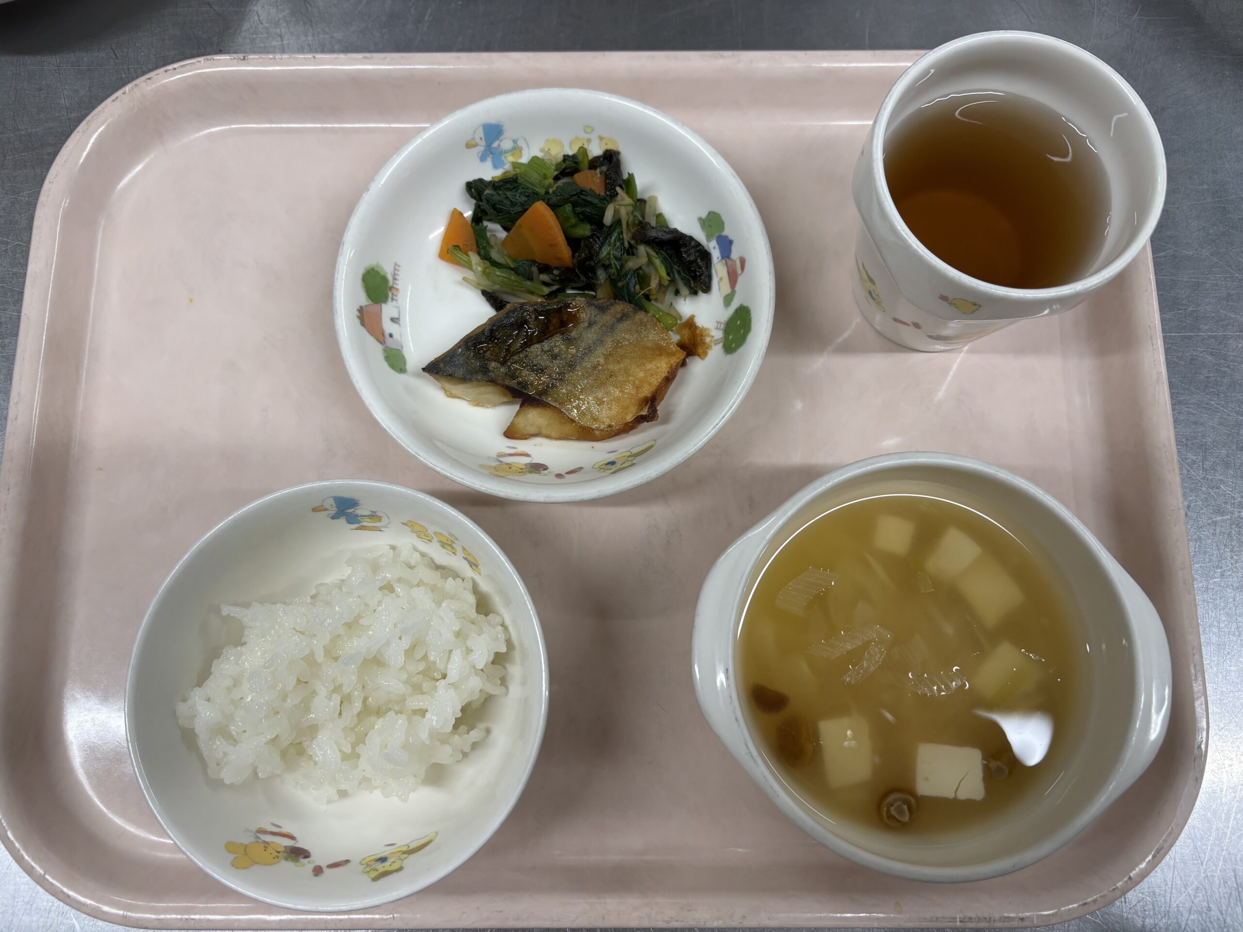 給食の献立 ごはん 味噌汁 さばの照り焼き 小松菜ののり和え