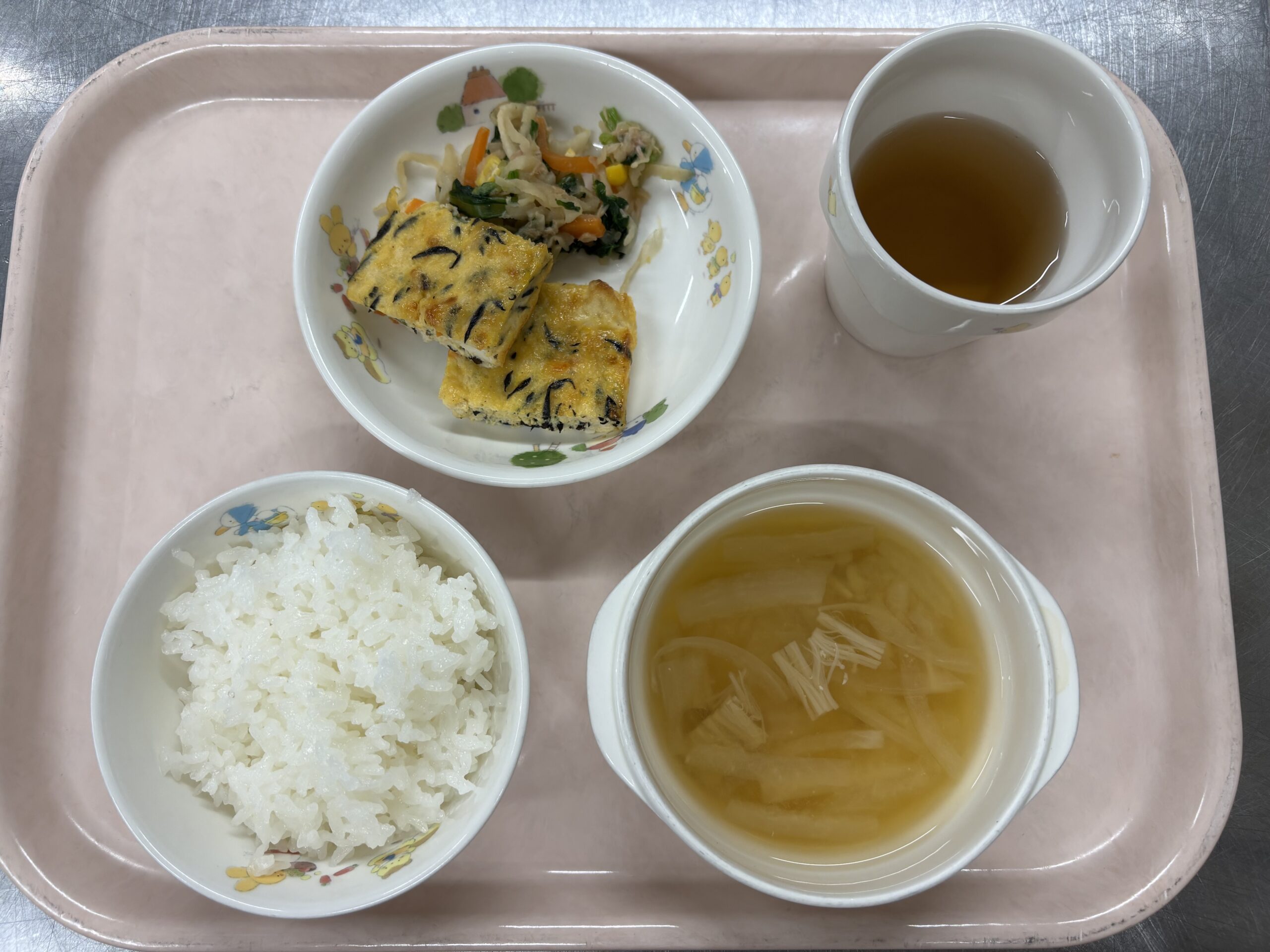 給食の献立 ごはん 味噌汁 擬製豆腐 切り干し大根のナムル
