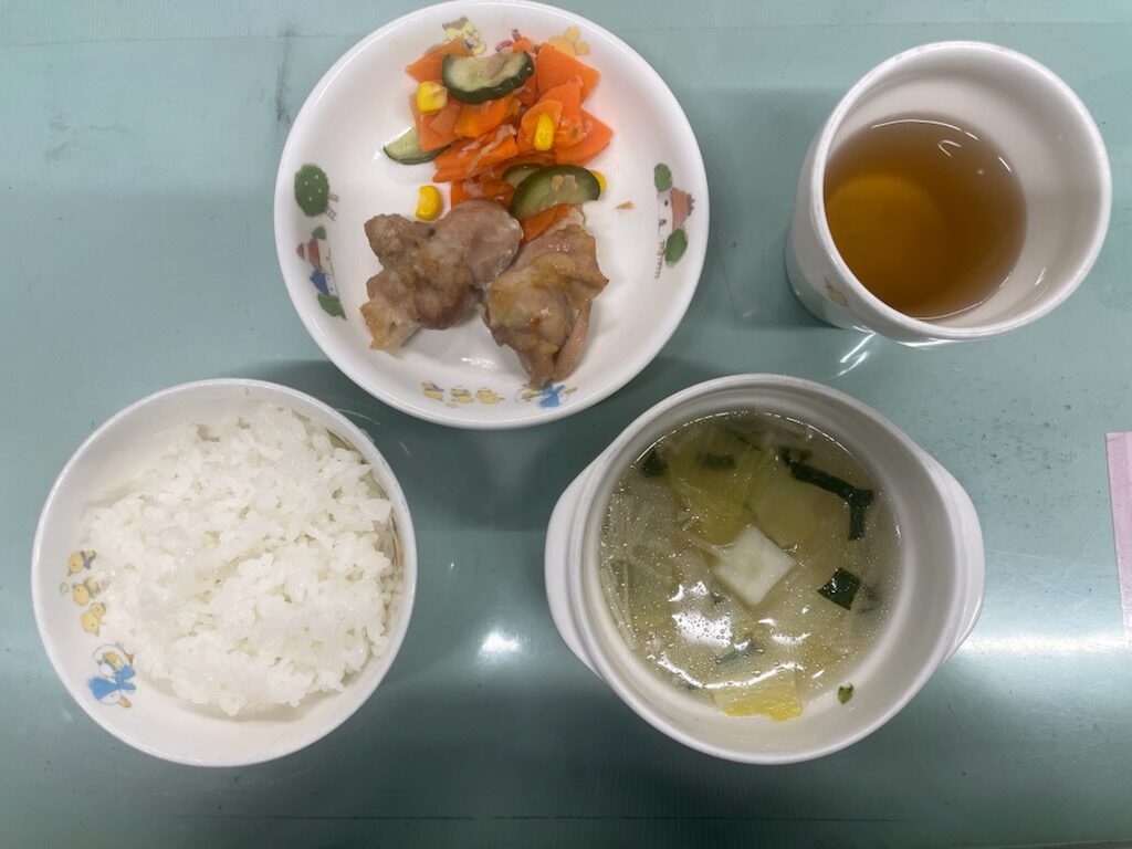 給食の献立 ごはん 野菜スープ グリルチキン 人参サラダ