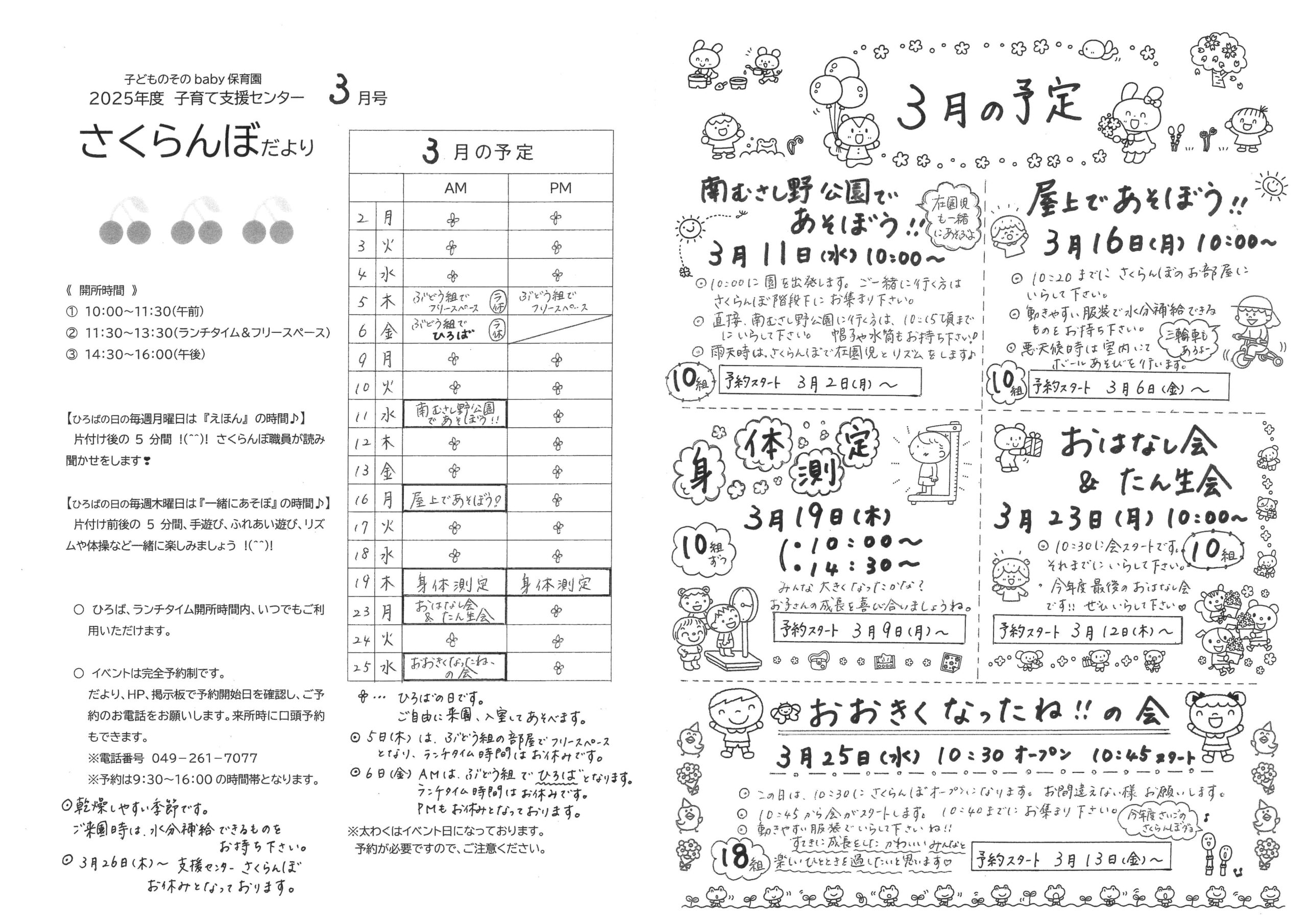 さくらんぼだより3月号ができました 2026/02/05 立春を迎え、春の訪れを感じる今日この頃、支援センターさくらんぼもとうとう年度末の3月となりました。気候の良いこの時期に、さくらんぼのイベントで、外遊びを楽しみませんか? 25日は、今年度最後のイベント、「おおきくなったね、の会」です。一年間心身ともに大きく成長したかわいいみんなと一緒に楽しく遊びたいと思っています! また、いつものひろばでも、たくさんお喋りして、ほっとひと時、親子でリラックスタイムはいかがですか? 3月も皆様のお越しをお待ちしております。