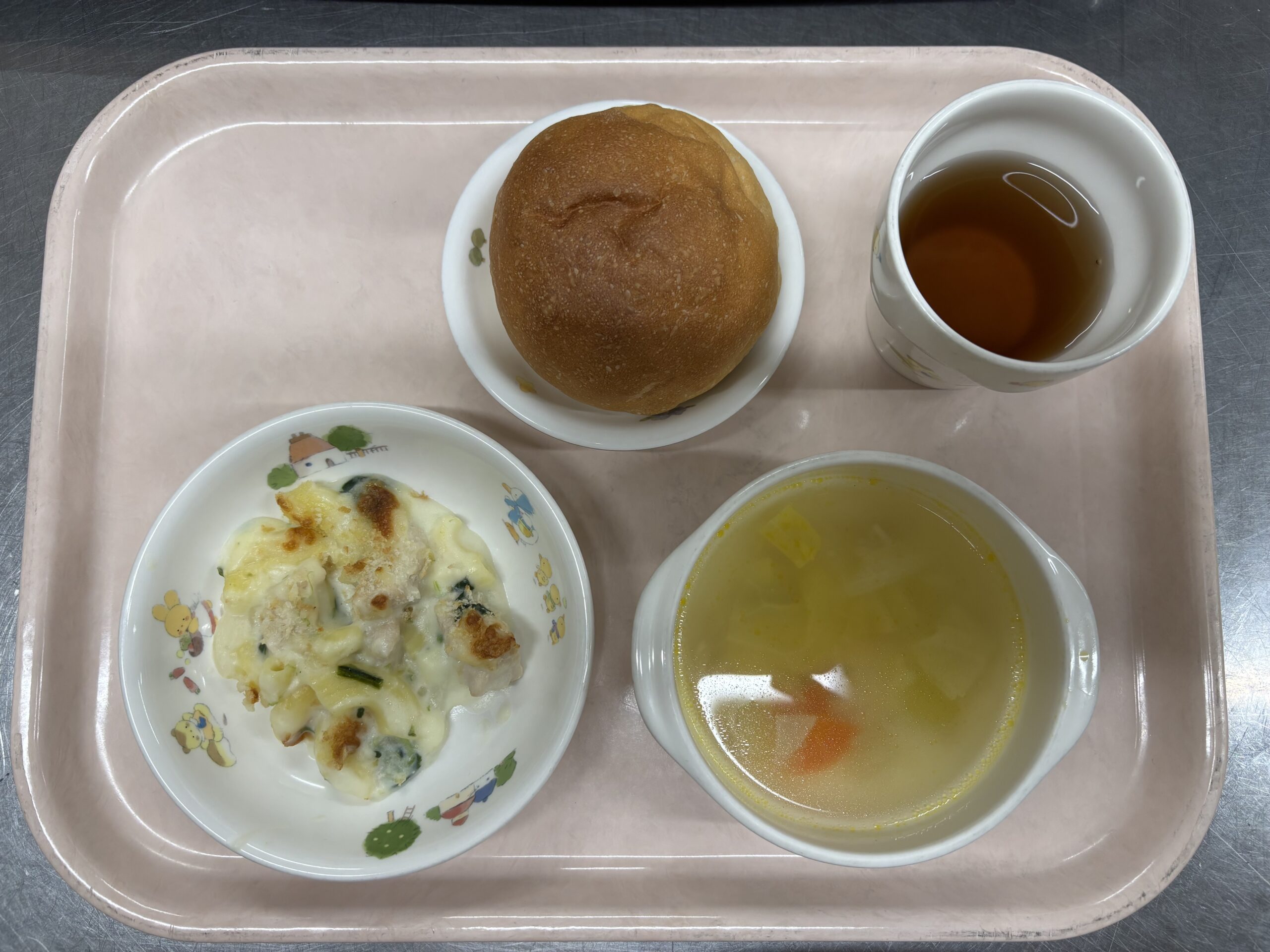 給食の献立 パン 野菜スープ 鶏肉のマカロニグラタン
