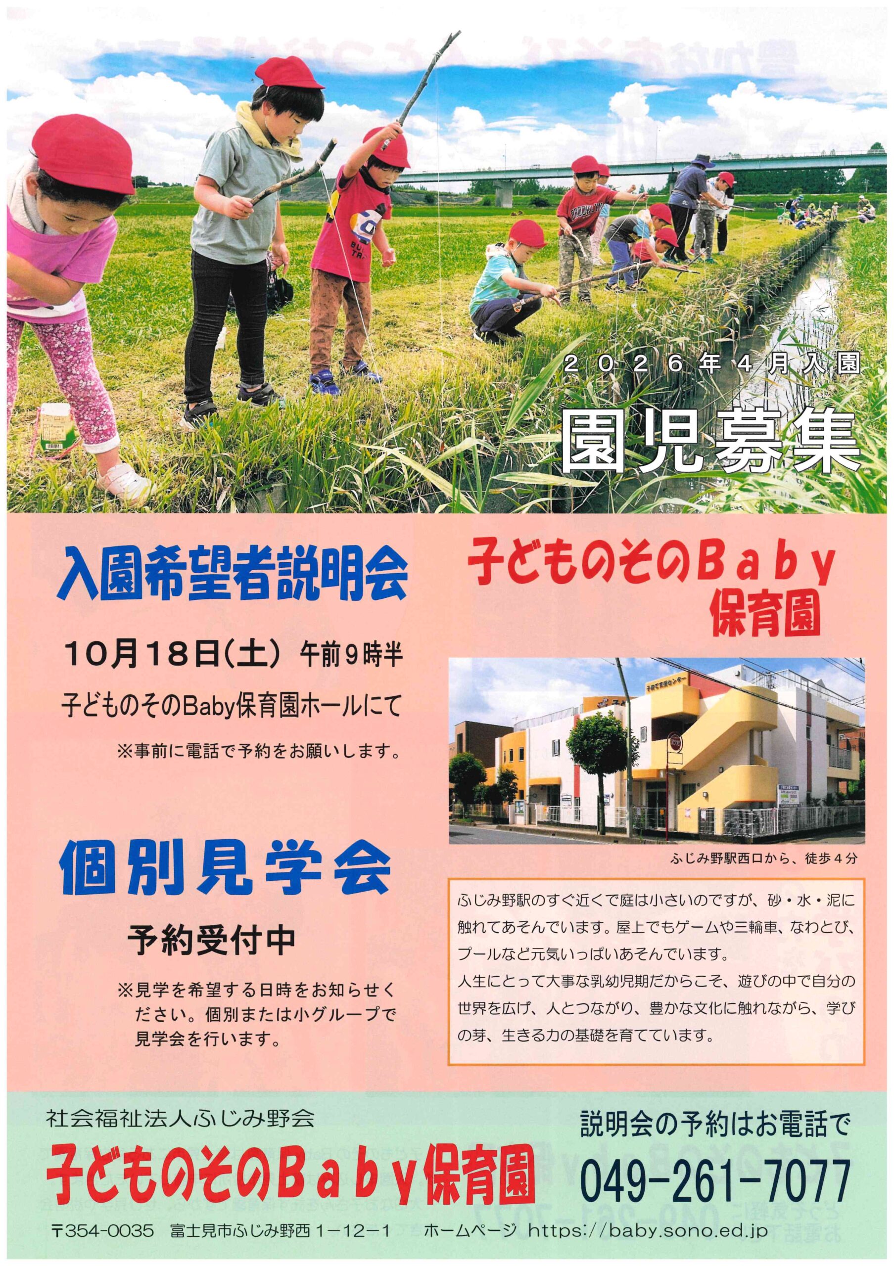 ★園見学&説明会★を行います 2025/09/22 園での普段の子どもたちの様子や保育方針などについて、園長からお話・ご説明をさせていただきます。 説明のあとに、園長の案内で園内をご見学いただけます。 子どものそのBaby保育園にご興味のある方、ぜひお越しください。 10月18日(土) 午前9時30分から *お子様連れOK! *ご夫婦・ご家族そろっての参加OK! お電話で、ご予約をお願いいたします。 TEL 0492617077 ご心配な事やわからない事などあれば、お問合せください。 ご連絡おまちしております。