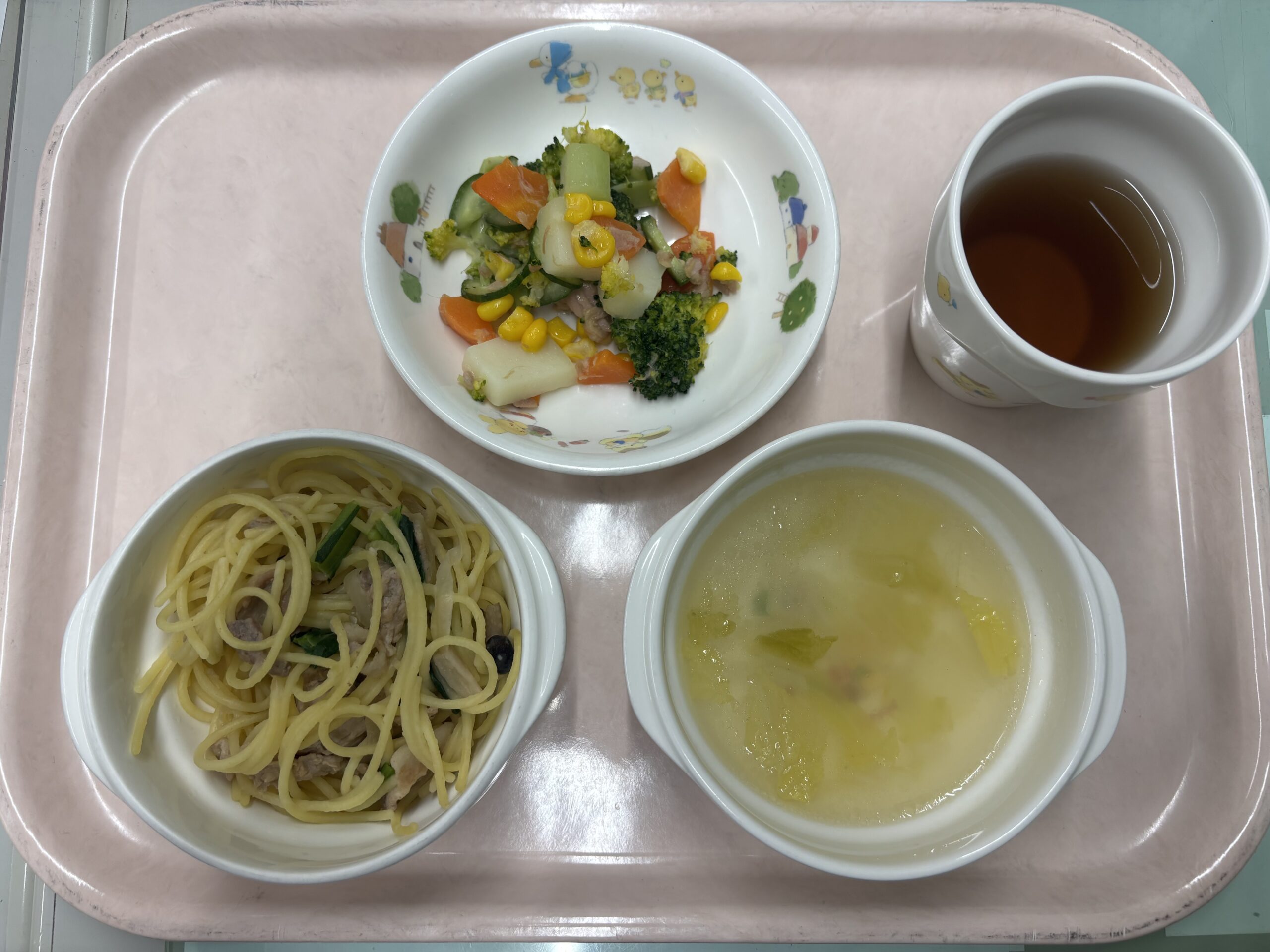 給食の献立 和風スパゲッティ 野菜スープ ブロッコリーのサラダ