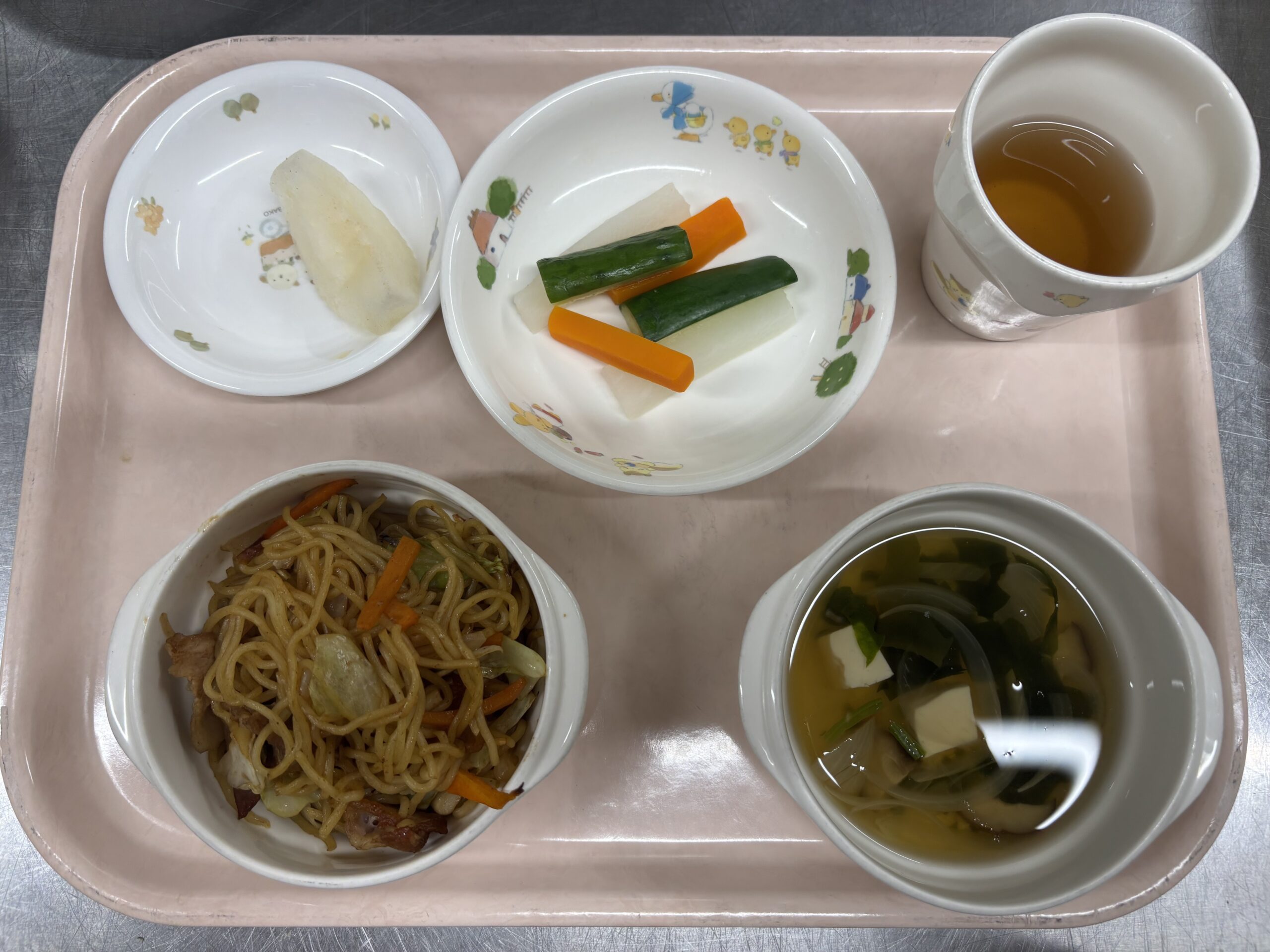 給食の献立 焼きそば 中華スープ 大根と人参のピクルス 梨