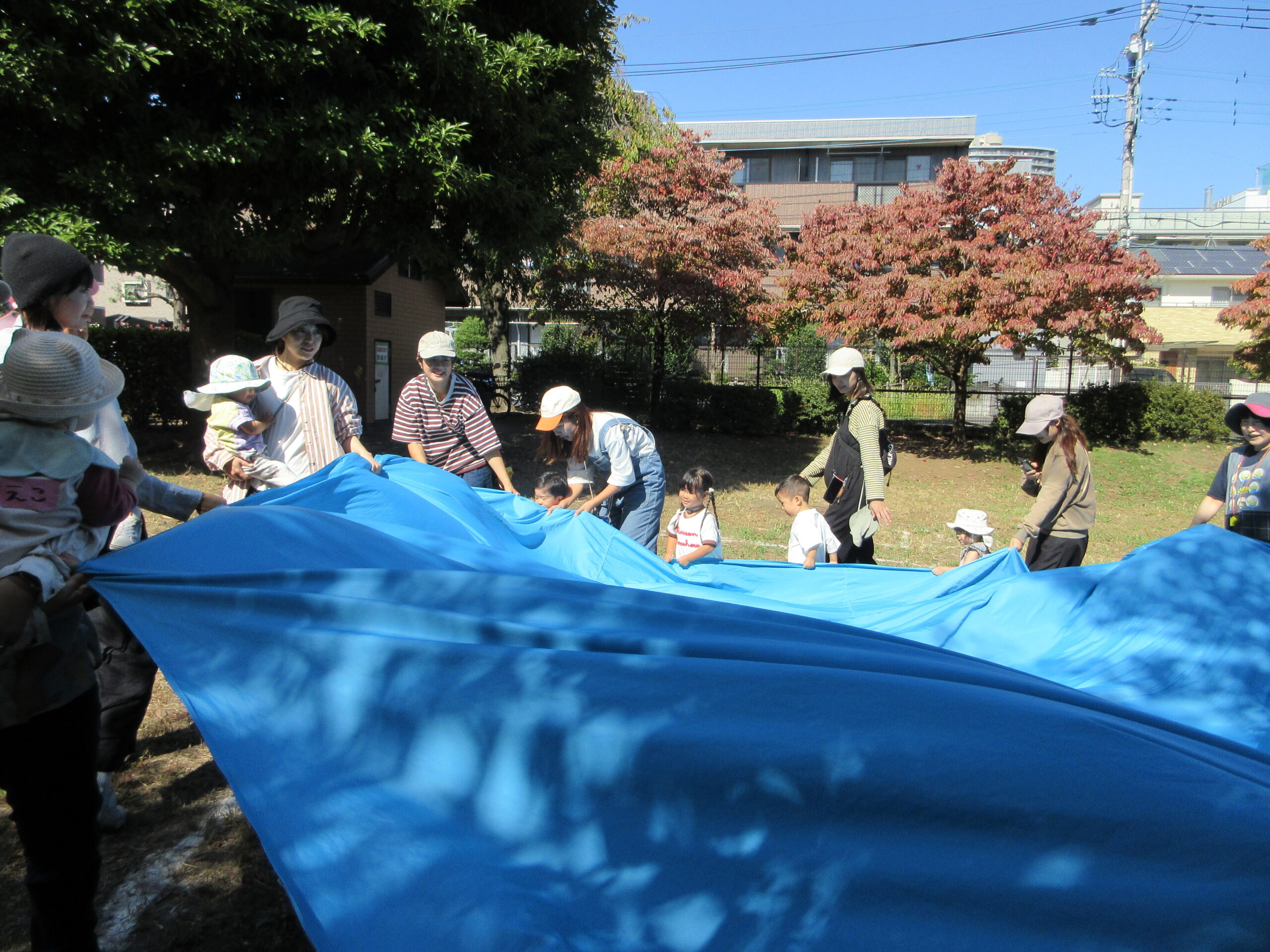 ④パラバルーン さんぽの曲に合わせてふわふわ。最後はみんなで中に入れるかな?