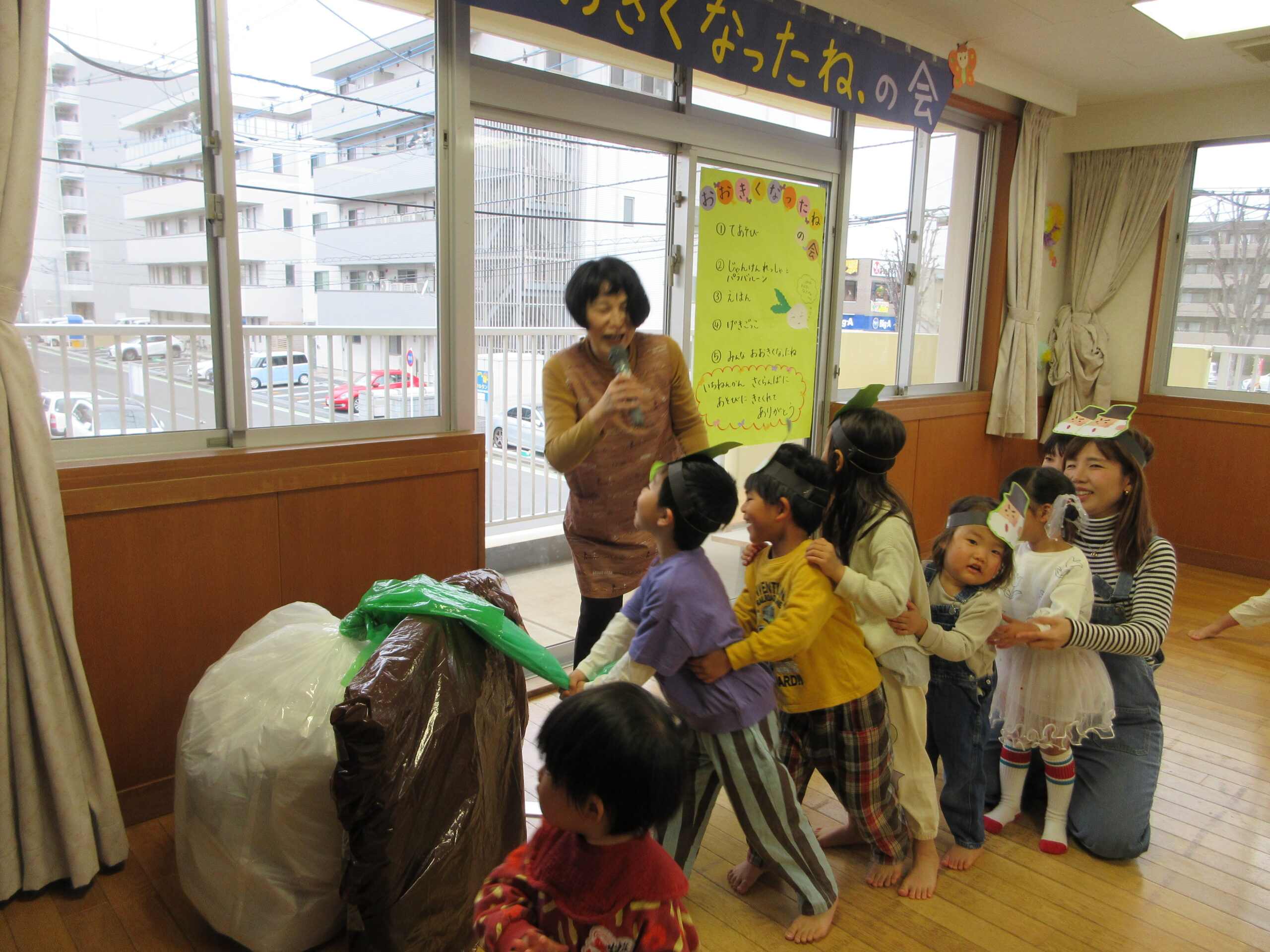みんなでお面をつけて、かわいいおじいさん・おばあさんたちがかぶをうんとこしょ!