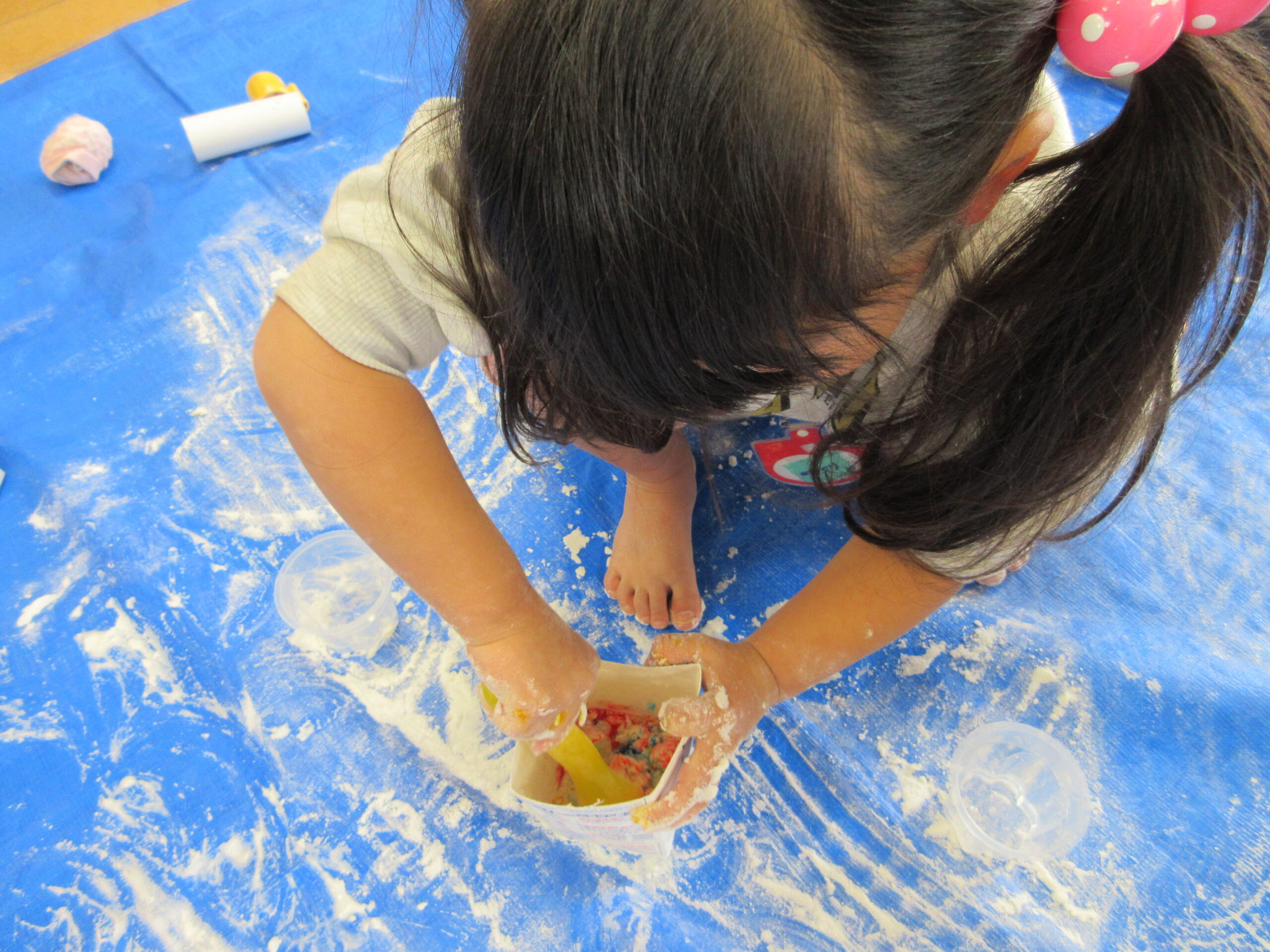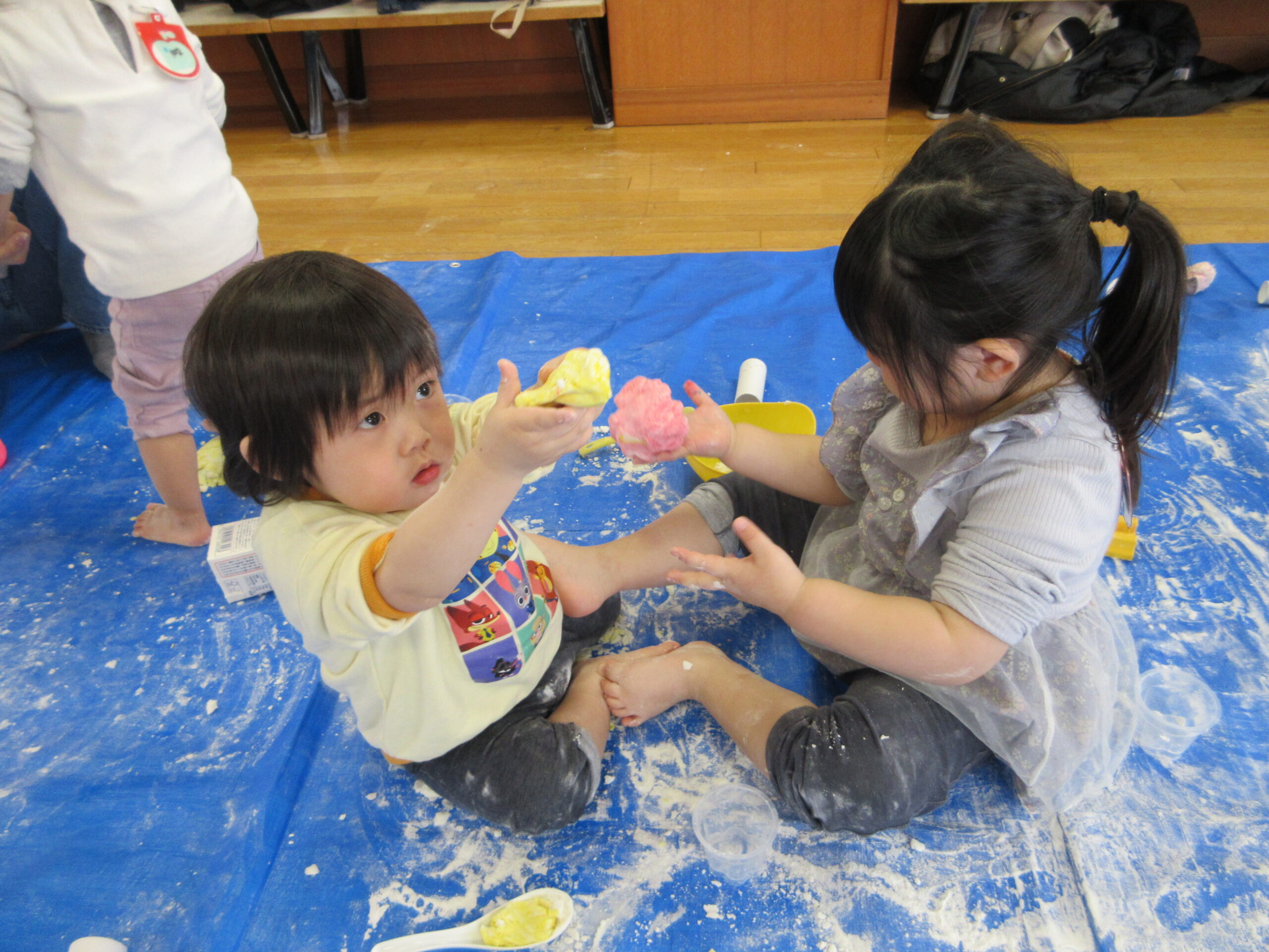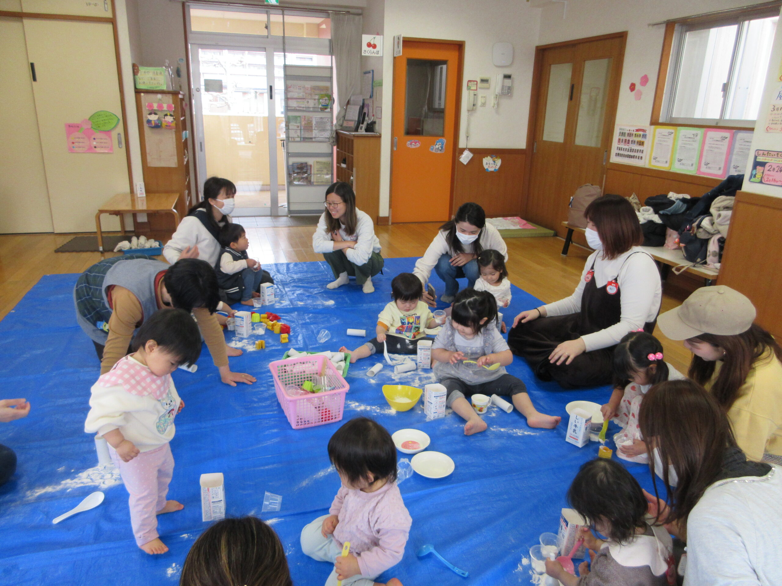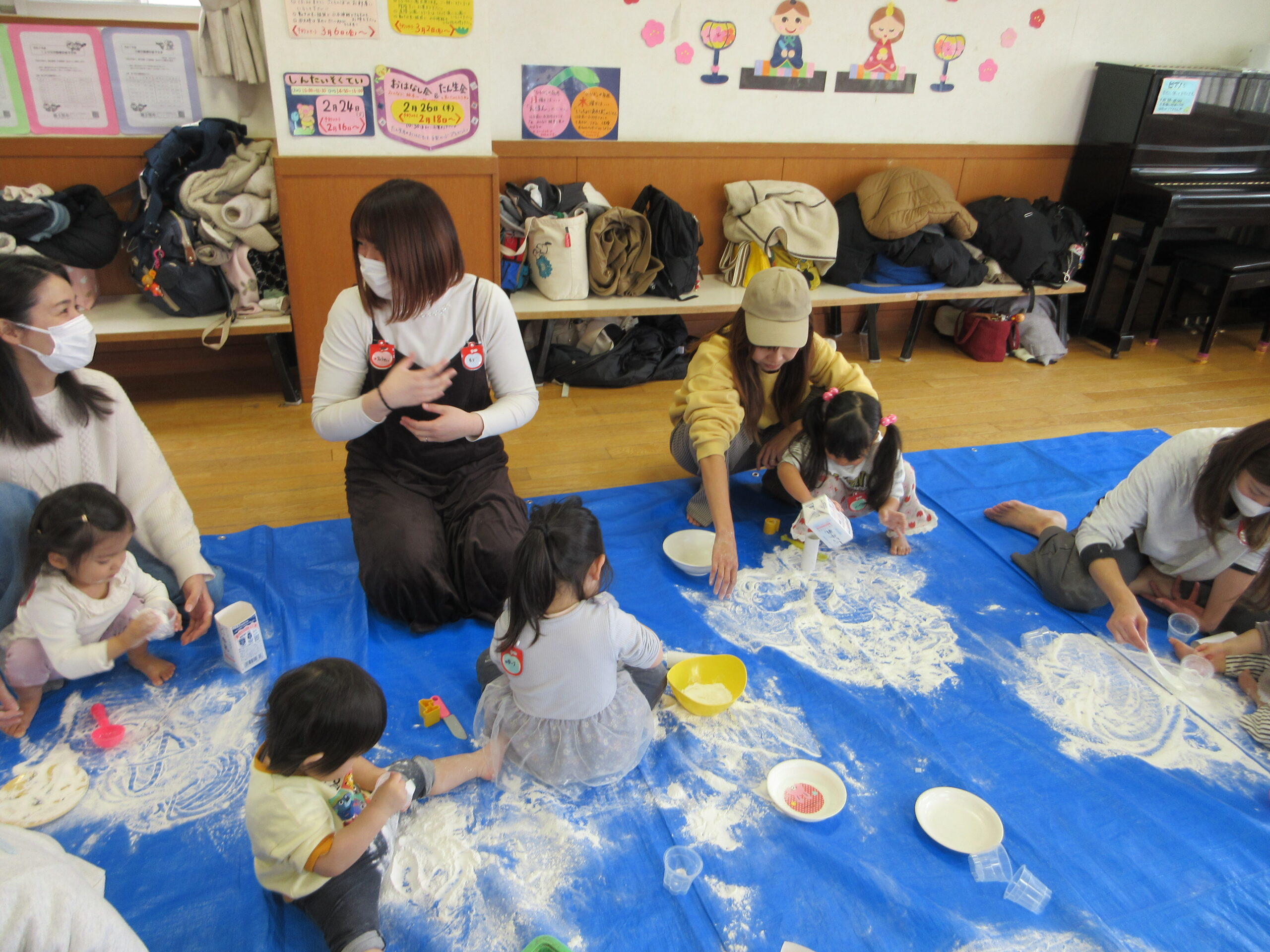 2026.2.20 イベント《米粉あそび》 2026/02/20 米粉で感触遊びのイベントがありました! まずはさらさらの状態で遊びます。 はじめはスプーンで容器からお皿などに移し替えてみたり。 少し慣れたら容器から出して手で触りました。 どんどん遊びがダイナミックになって、広げた粉で絵を描いたり、 足にかけたり、踏んでみたり。 たのしくなってきたところで、お水を足して粘土に! 食紅も足して色んな色に! みんな上手に遊んでいました♪ 今回もたくさんのご参加ありがとうございました!